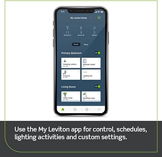- MY LEVITON APP: Use for scheduling, remote control and dimmer settings (requires MLWSB Wi-Fi Bridge)