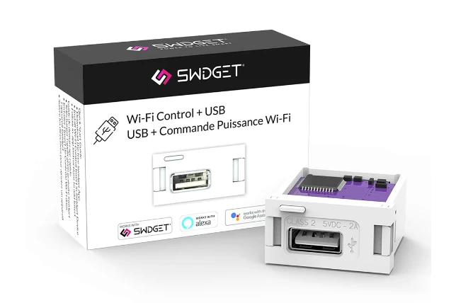 Designed to be integrated into all major Smart Home protocols, the Swidget Wi-Fi Control + USB Charger provides dual functions. The Wi-Fi connectivity transforms the Swidget Outlet or Switch into a Wi-Fi smart device. The USB Charger interface provides a standard Type A USB Charger to allow for the fast-charging of your devices.